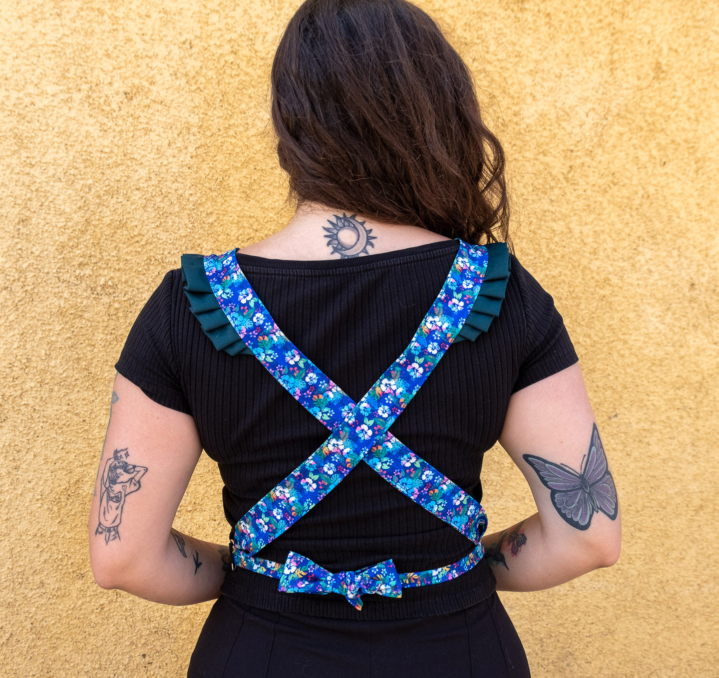 Colores y telas: Al igual que en todas las prendas puedes escoger tu combinación de telas indicando tus preferencias seleccionándolas arriba. El cuerpo sera del color liso que selecciones en los circulos y la amarra del estampado que quieras de los cuadrados. Si tienes dudas sobre las características de las telas revisa aqui.